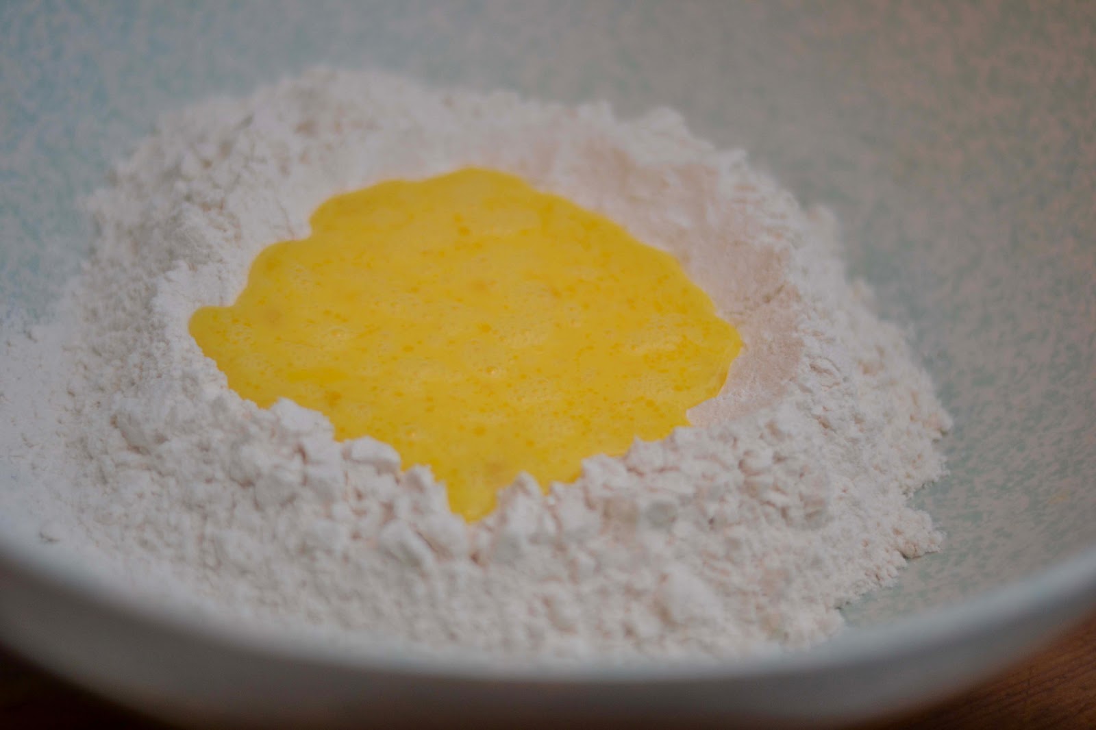 Pour the egg mixture into the flour and combine until a dough forms... as the recipe says make sure not to force the dough to take all the flour just incorporate as much as it needs.